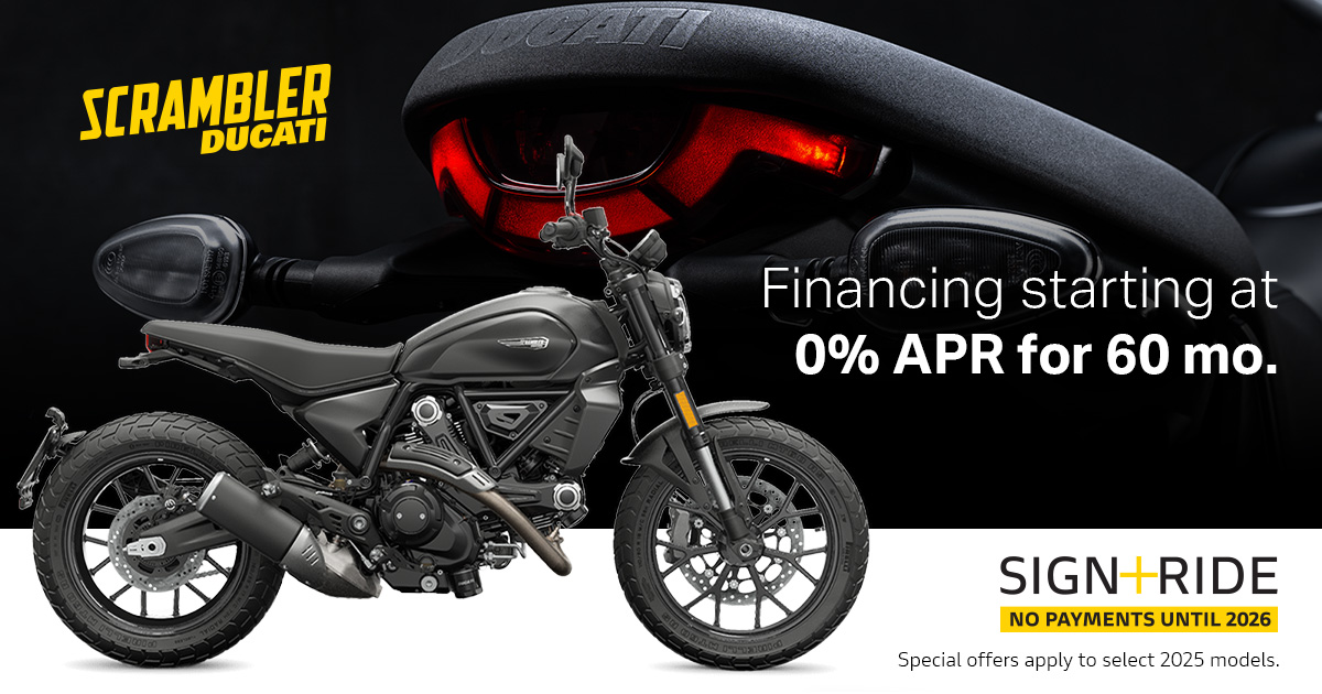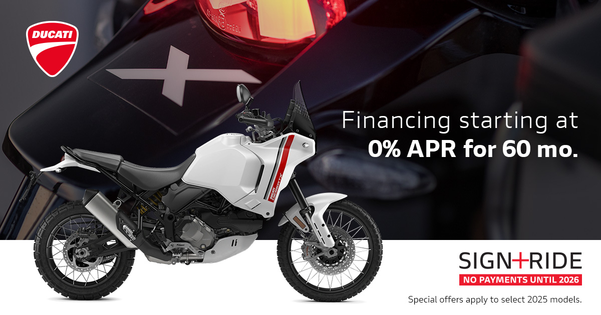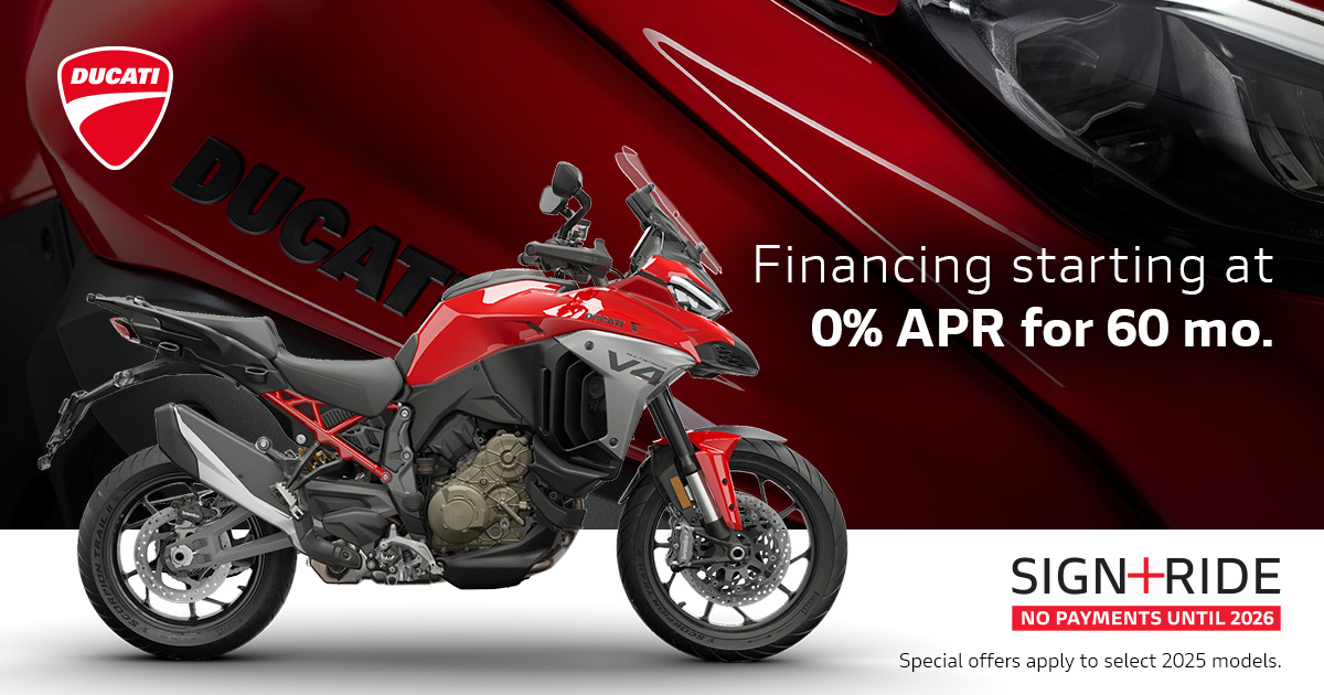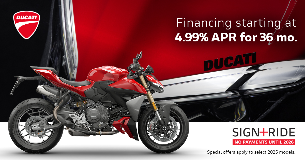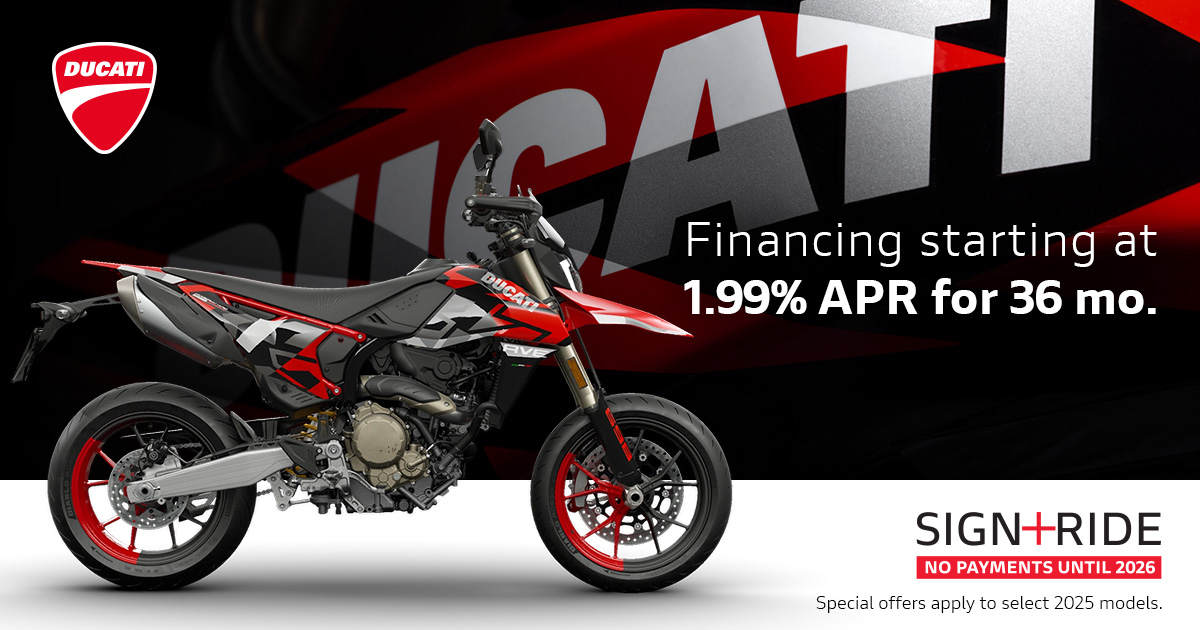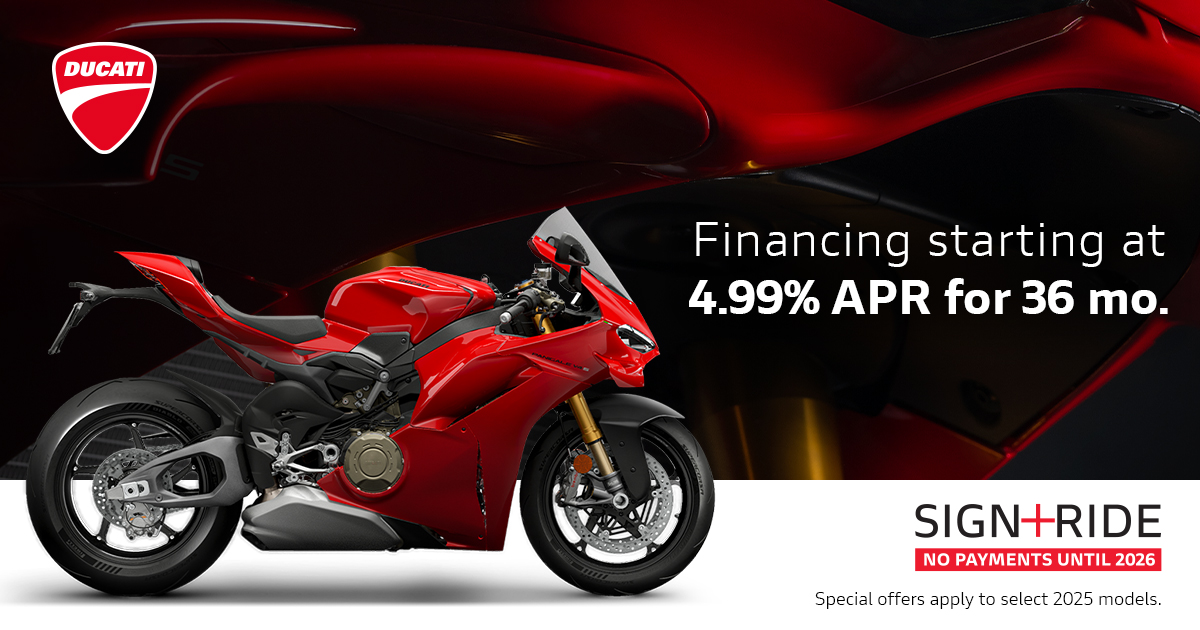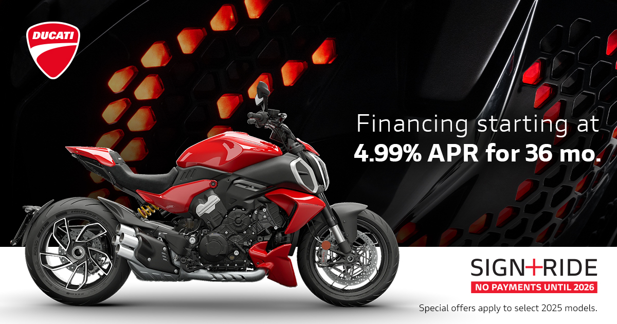 Offer available on select 2024 and 2025 models to highly qualified customers on approved credit by Ducati Financial Services through participating and authorized Ducati dealers from September 3 - 30, 2025. Down payment requirement varies from 0%-25% of the purchase price based on credit worthiness. Not all customers will qualify for the advertised APR. Minimum amount financed is $5,000. See your local Ducati dealer for financing details or, for general product information, call 1-888-391-5446. VW Credit, Inc. dba Ducati Financial Services is a servicer for VCI Loan Services, LLC. © 2025 Ducati North America.